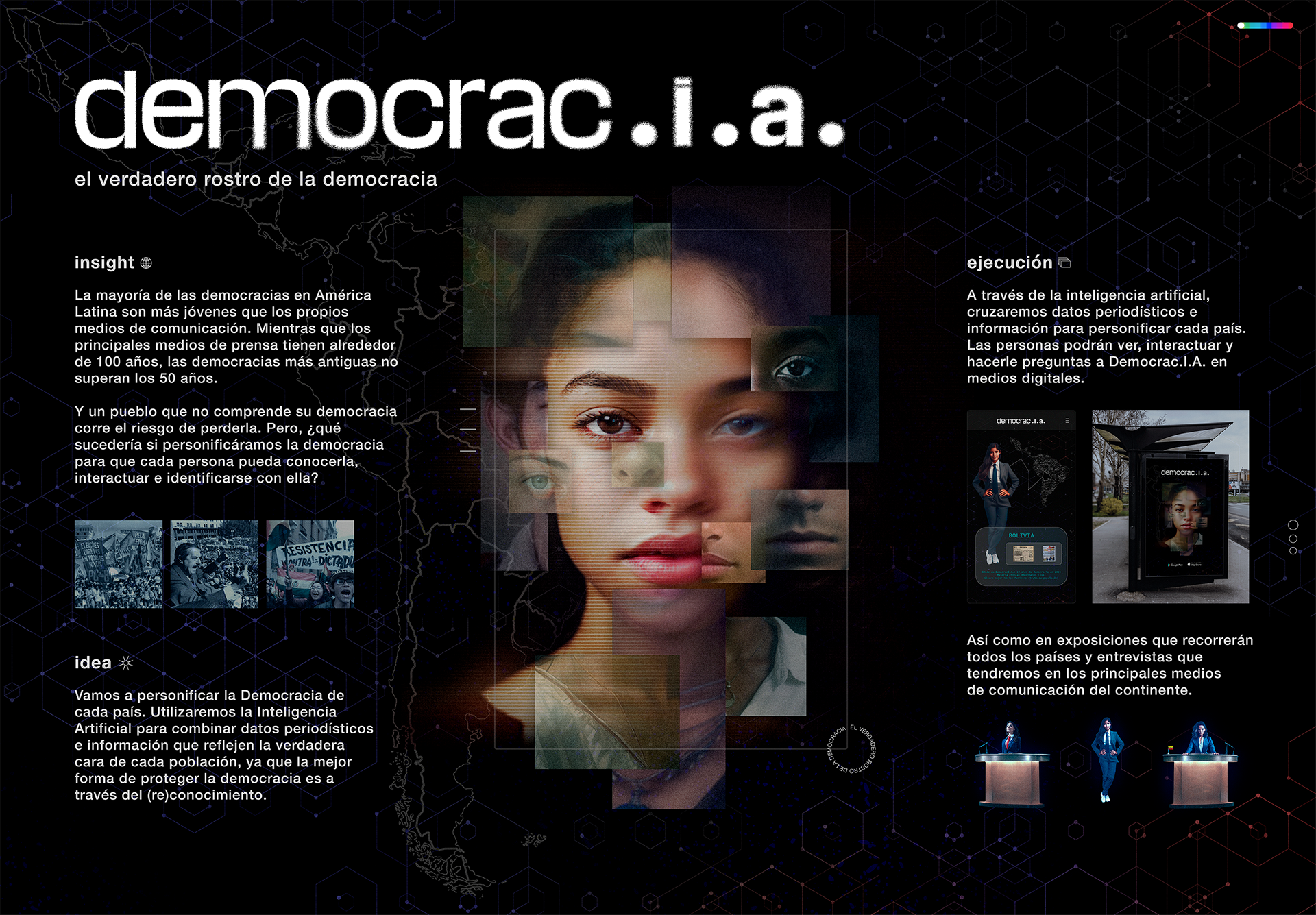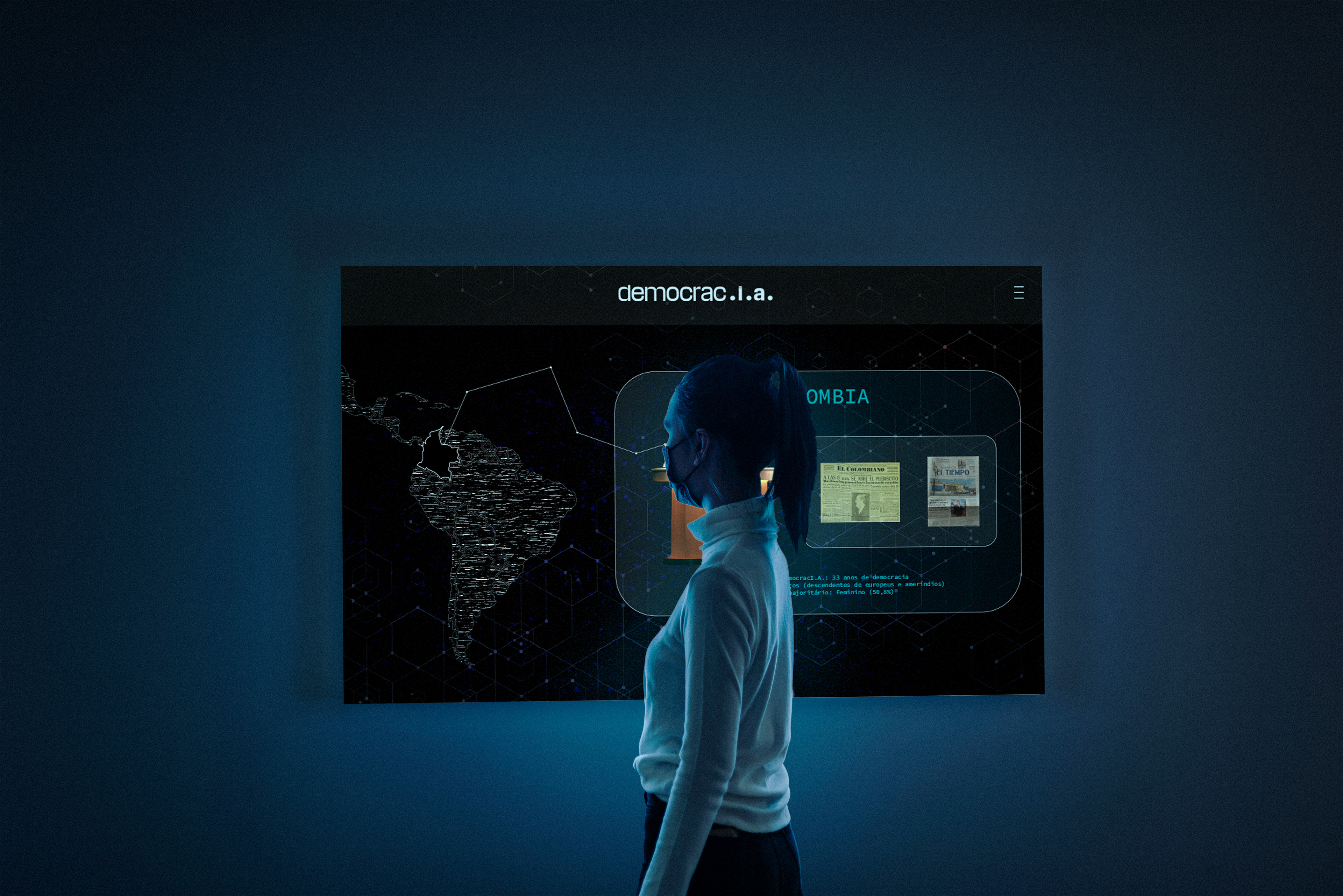 Utilizamos Inteligência Artificial para cruzar décadas de dados jornalísticos e sintetizar a identidade política de cada país em uma persona única. O resultado foi uma exposição interativa onde a democracia ganhou voz, rosto e a capacidade de dialogar com o povo.